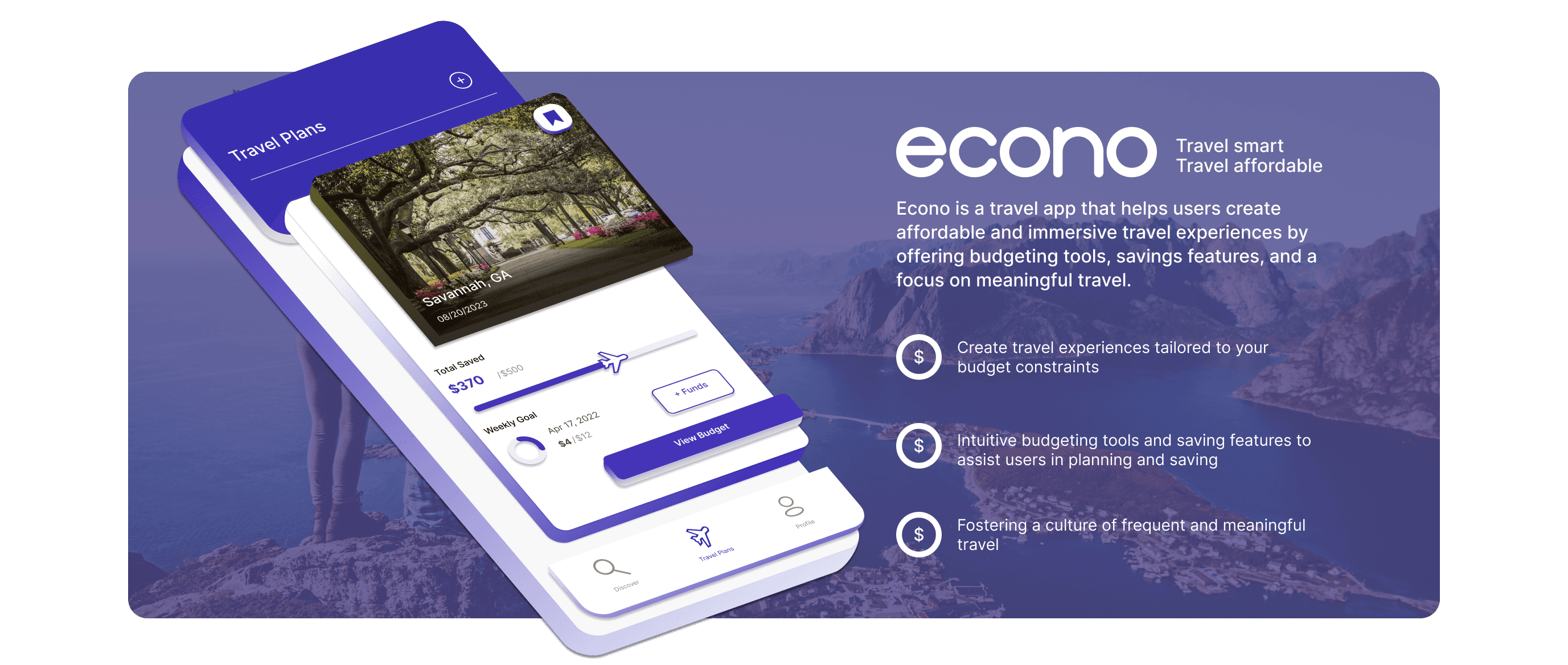 Econo is an upcoming travel application that offers users the opportunity to curate enriching and immersive travel experiences that are tailored to their financial constraints. It provides intuitive budgeting tools and savings features to assist users in planning and saving for their travel aspirations, thereby fostering a culture of frequent and meaningful travel.